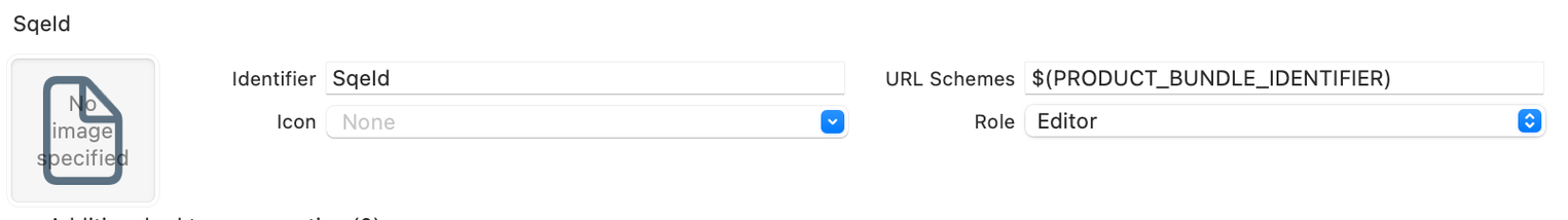 Go to Xcode, go to the Info tab of your app target settings. In the URL Types section, click the + button to add a new entry. There, enter SqeId into the Identifier field and $(PRODUCT_BUNDLE_IDENTIFIER) into the URL Schemes field.